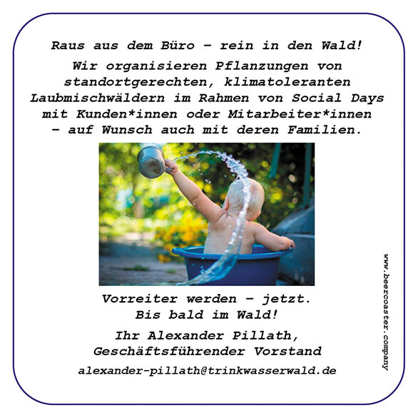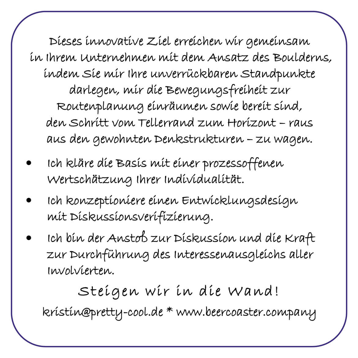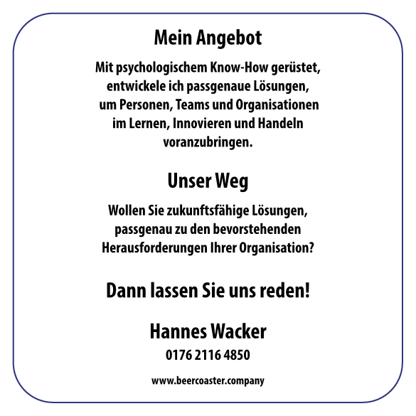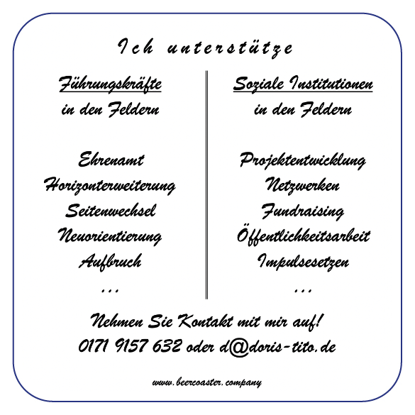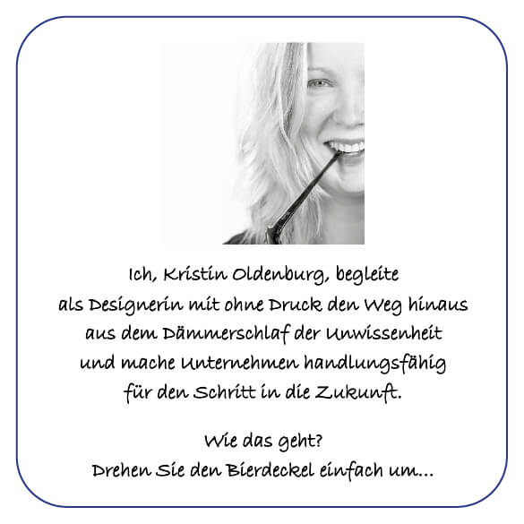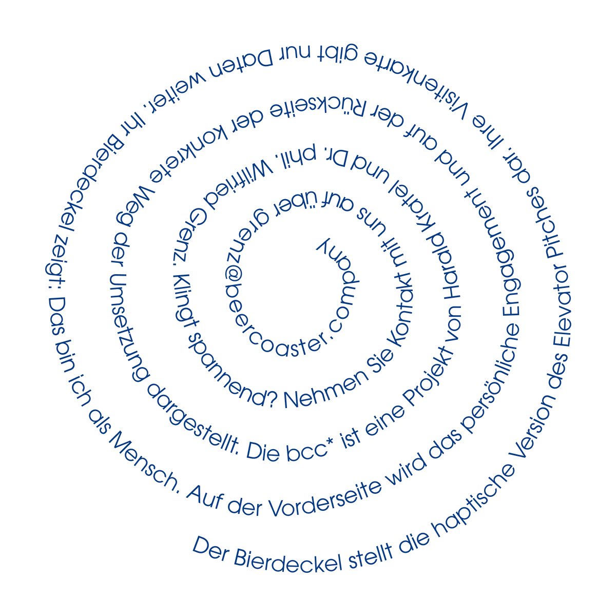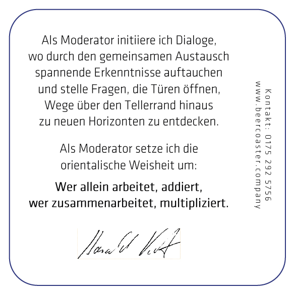 Der Bierdeckel stellt die haptische Version des Elevator Pitches dar. Die Visitenkarte gibt nur Daten weiter. Der Bierdeckel zeigt: Das bin ich als Mensch. Die Texte folgen dem Hinweis