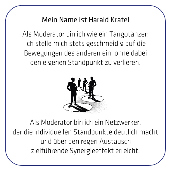 Der Einstieg gestaltet sich so, dass die Personen gemeinsam mit Harald Kratel – der als Moderator einen festen Platz im Innenkreis hat, um die Diskussion zu begleiten – sowie einem freien Stuhl im Innenkreis sitzen und beginnen, das Thema zu diskutieren. Dabei können sie jederzeit in den Aussenkreis wechseln, wenn dort ein Stuhl frei wird.